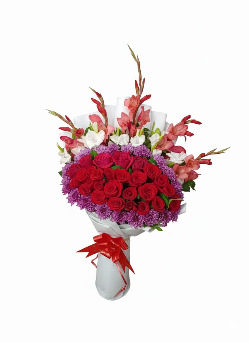This arrangement is very bold and features a beautiful combination of deep red and rich purple tones. It is wrapped in white paper and tied with a bright red ribbon. .